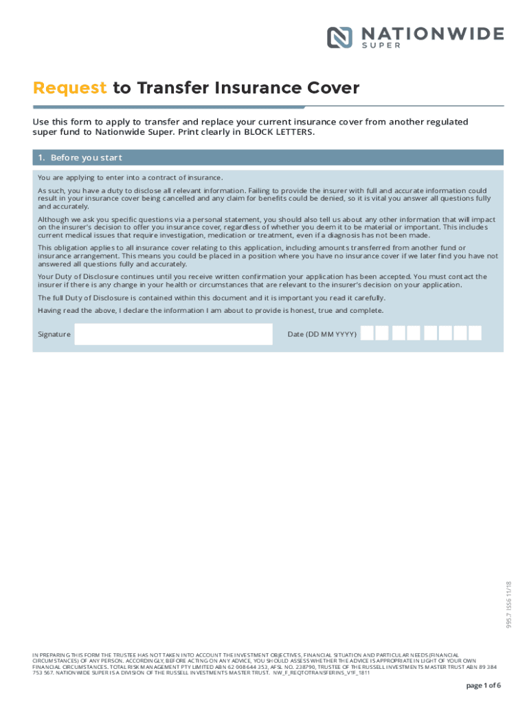 Request to Transfer Insurance Cover Use this form to apply to transfer and replace your current insurance cover from another regulated super fund to Nationwide Super. Print clearly in BLOCK LETTERS.