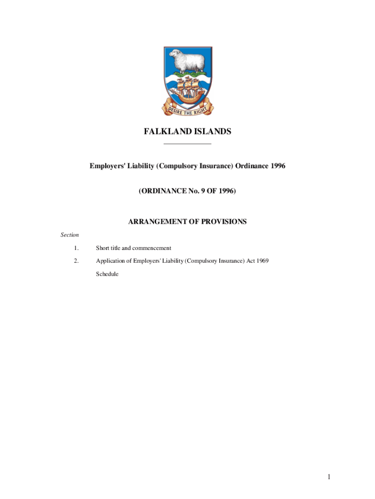 FALKLAND ISLANDS ___ Employers\' Liability (Compulsory Insurance) Ordinance 1996 (ORDINANCE No. 9 OF 1996)ARRANGEMENT OF PROVISIONS Section 1. Short title and commencement2. Application of Employers\'