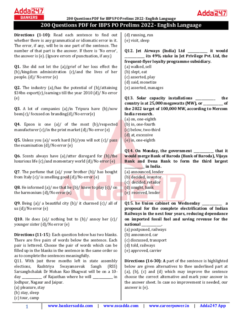 200 Questions PDF for IPS PO Prelims 2022 English Language200 Questions PDF for IPS PO Prelims 2022 English Language Directions (110): Read each sentence to find out whether there is any grammatical