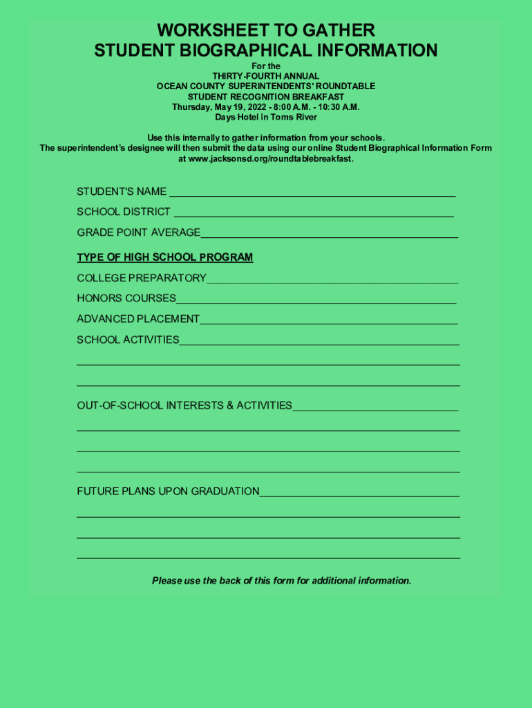 WORKSHEET TO GATHER STUDENT BIOGRAPHICAL INFORMATION For the THIRTYFOURTH ANNUAL OCEAN COUNTY SUPERINTENDENTS\' ROUNDTABLE STUDENT RECOGNITION BREAKFAST Thursday, May 19, 2022 8:00 A.M. 10:30 A.M.