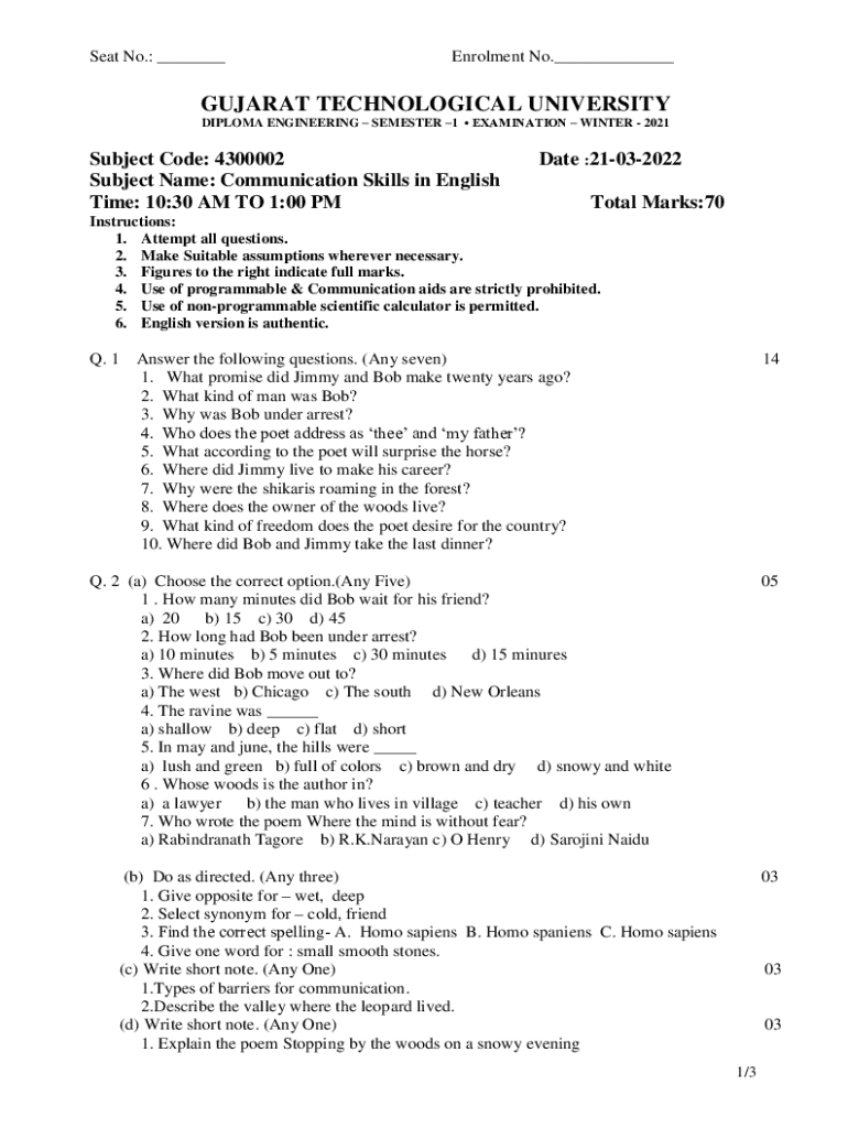 Seat No.: ___Enrollment No.___GUJARAT TECHNOLOGICAL UNIVERSITY DIPLOMA ENGINEERING SEMESTER 1 EXAMINATION WINTER 2021Subject Code: 4300002 Subject Name: Communication Skills in English Time: 10:30
