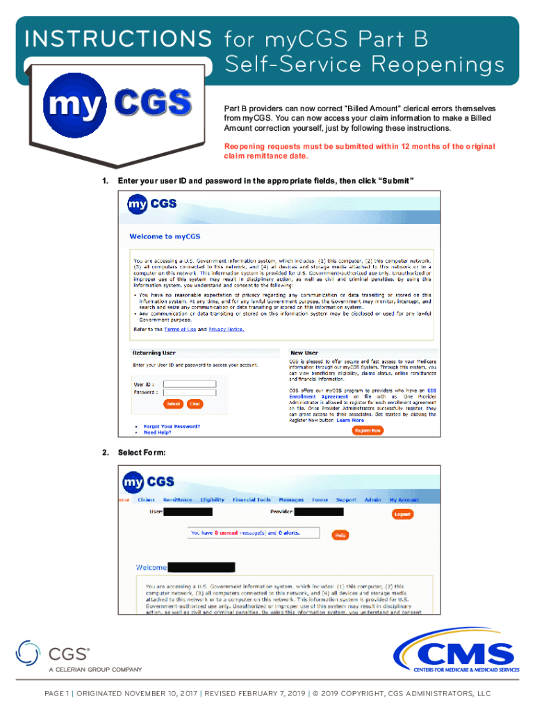 INSTRUCTIONS for my CGS Part B Self-service ReopeningsmyPart B providers can now correct Billed Amount clerical errors themselves from my CGS. You can now access your claim information to make a Billed