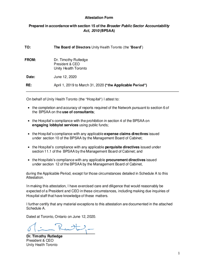 Attestation Form Prepared in accordance with section 15 of the Broader Public Sector Accountability Act, 2010 (BP SAA)TO:The Board of Directors Unity Health Toronto (the Board)FROM:Dr. Timothy Rutledge