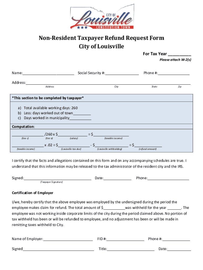 Get the free Non-Resident Taxpayer Refund Request Form City of Louisville