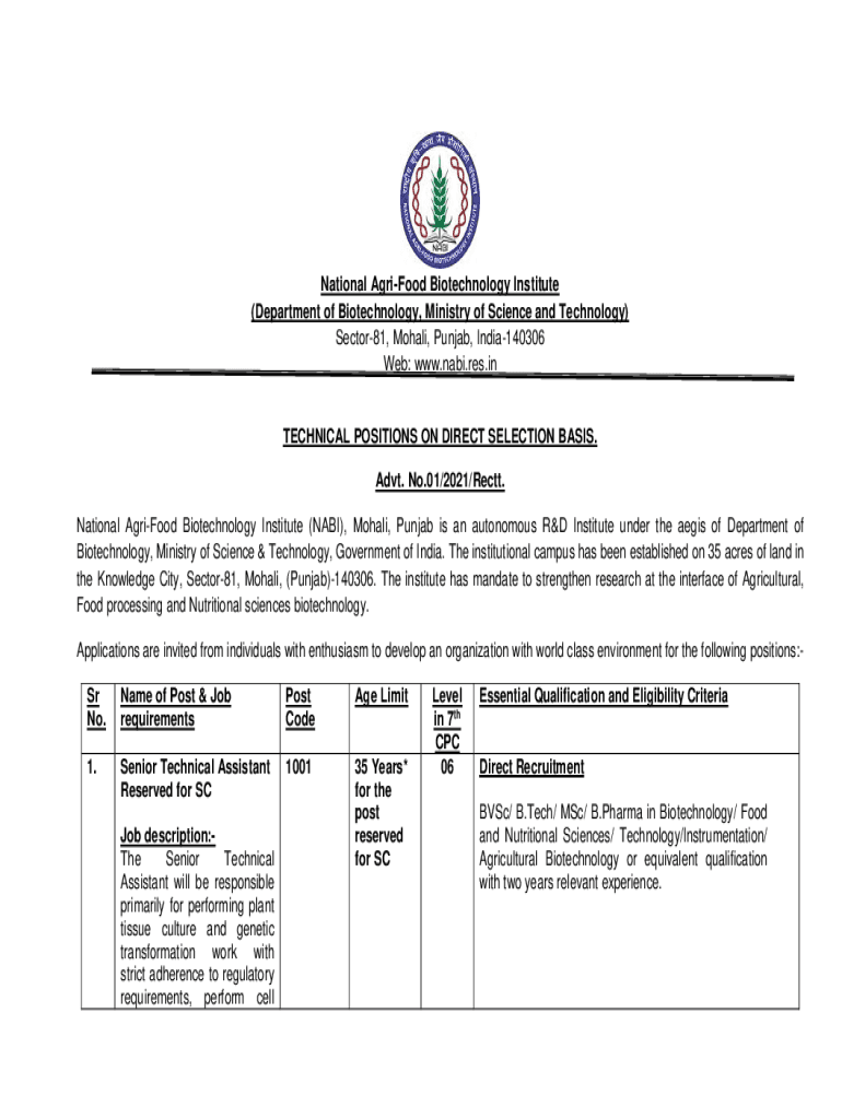 National Agri-food Biotechnology Institute (Department of Biotechnology, Ministry of Science and Technology) Sector81, Moral, Punjab, India140306 Web: www.nabi.res.inTECHNICAL POSITIONS ON DIRECT
