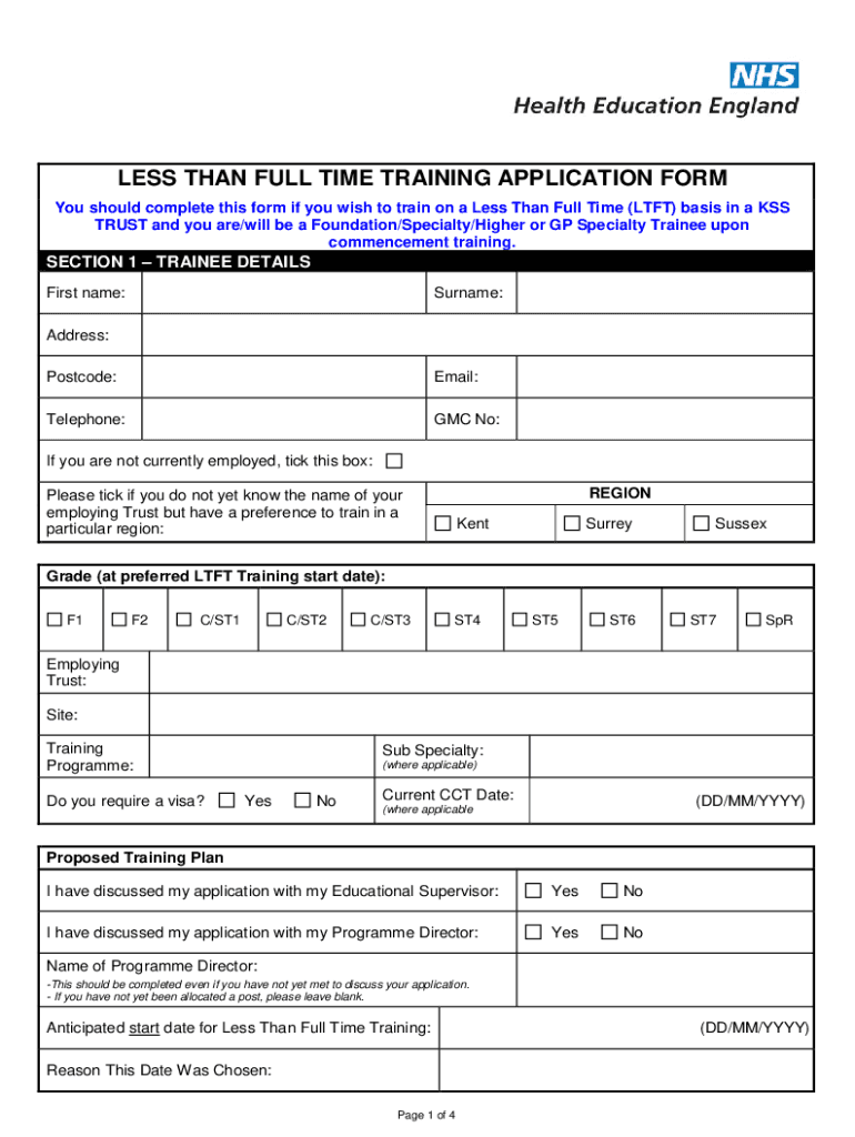 LESS THAN FULL TIME TRAINING APPLICATION FORM You should complete this form if you wish to train on a Less Than Full Time (LEFT) basis in a KSS TRUST and you are/will be a Foundation/Specialty/Higher