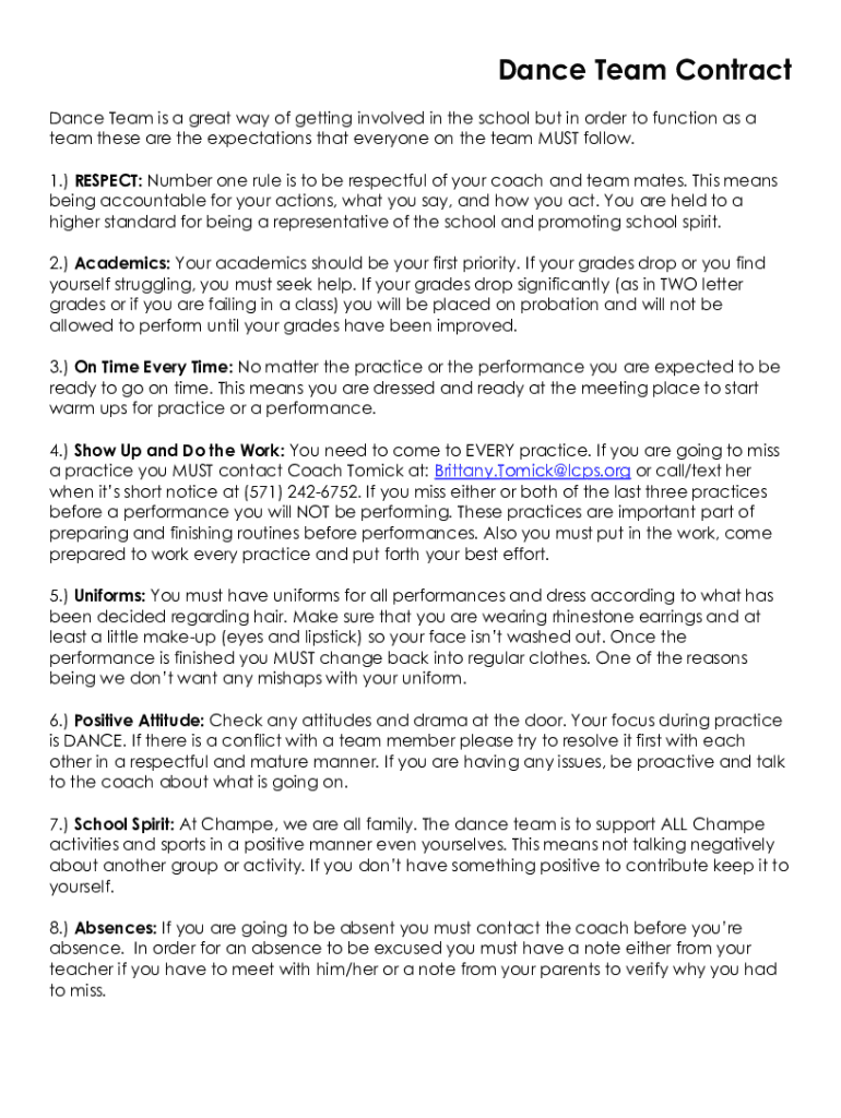 Dance Team Contract Dance Team is a great way of getting involved in the school but in order to function as a team these are the expectations that everyone on the team MUST follow. 1.) RESPECT: Number