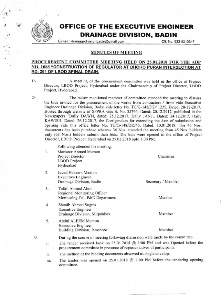 OFFICE OF THE EXECUTIVE ENGINEER DRAINAGE DIVISION, BASIN Email : drainagedivisionbadingmail.cutoff: No. 0229210347MINUTES OF MEETING PROCUREMENT COMMITTEE MEETING HELD ON 25.01.2018 FOR THE ADP NO.