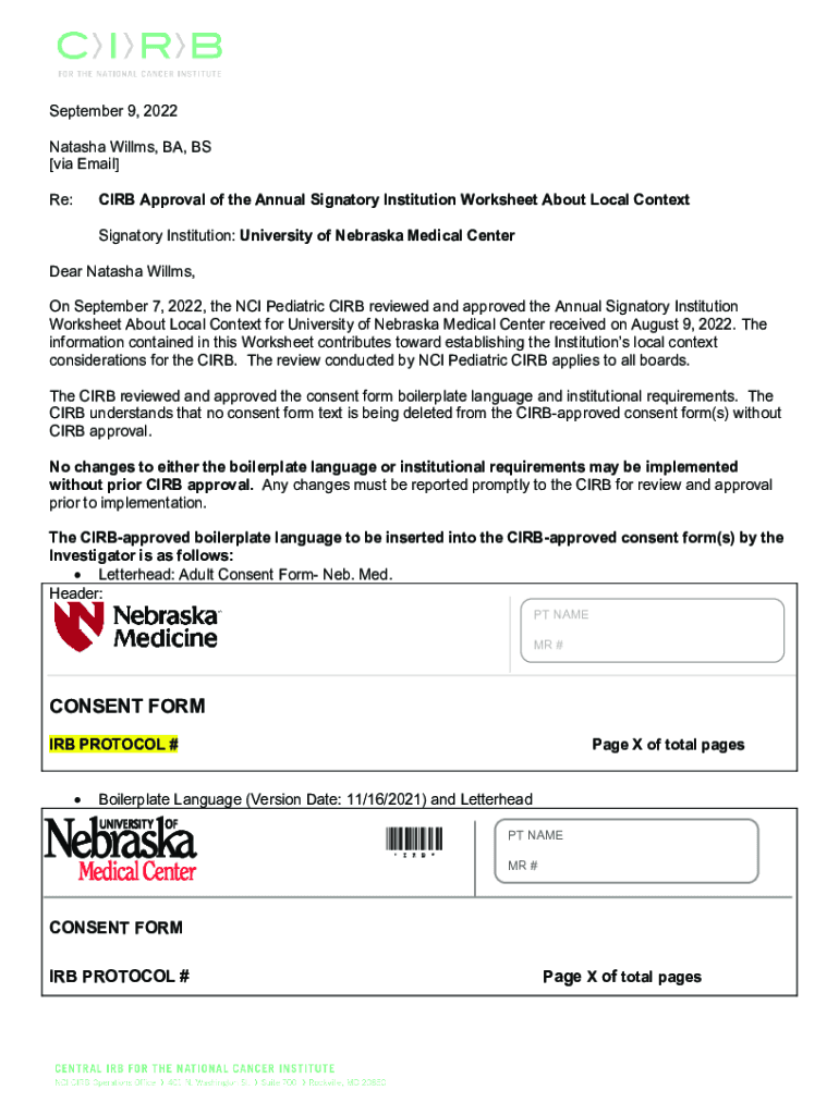 September 9, 2022, Natasha Willis, BA, BS [via Email] CIRB Approval of the Annual Signatory Institution Worksheet About Local Context Re:Signatory Institution: University of Nebraska Medical Center