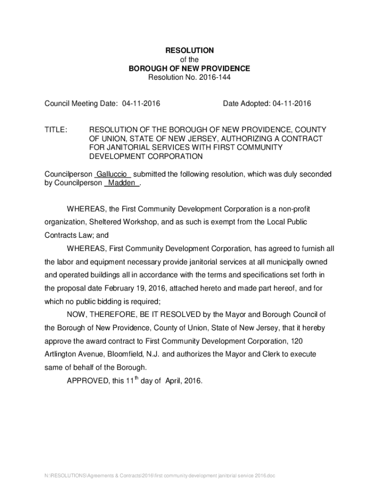 RESOLUTION of the BOROUGH OF NEW PROVIDENCE Resolution No. 2016144Council Meeting Date: 04112016TITLE:Date Adopted: 04112016RESOLUTION OF THE BOROUGH OF NEW PROVIDENCE, COUNTY OF UNION, STATE OF NEW