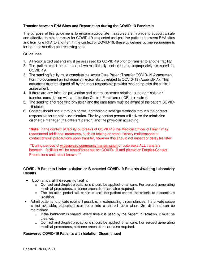 Transfer between RNA Sites and Repatriation during the COVID-19 Pandemic The purpose of this guideline is to ensure appropriate measures are in place to support a safe and effective transfer process