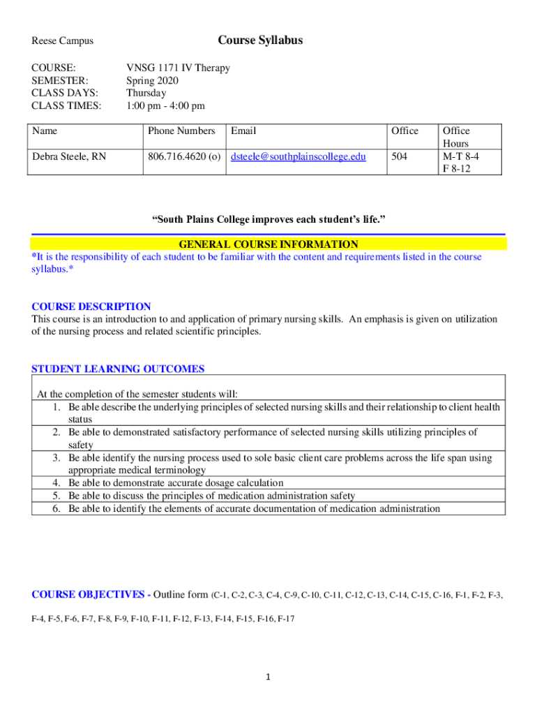 Course Syllabus Reese Campus COURSE: SEMESTER: CLASS DAYS: CLASS TIMES:ENSG 1171 IV Therapy Spring 2020 Thursday 1:00 pm 4:00 pmNamePhone NumbersEmailOfficeDebra Steele, RN806.716.4620 (o) dsteele@southplainscollege.edu504Office