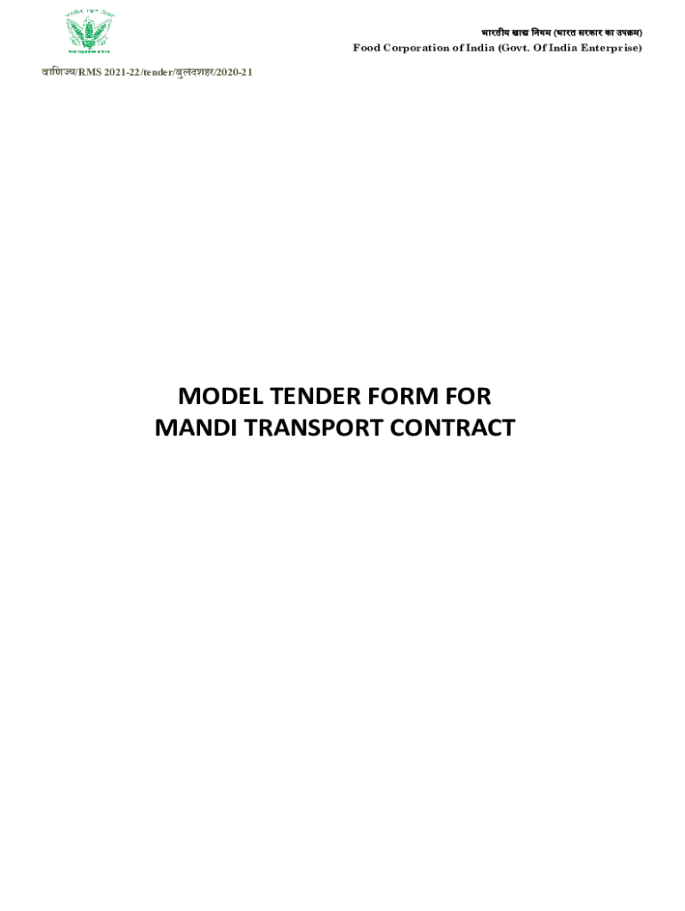 ()Food Corporation of India (Govt. Of India Enterprise)/RMS 202122/tender//202021MODEL TENDER FORM FOR MANDY TRANSPORT CONTRACT ()Food Corporation of India (Govt. Of India Enterprise)/RMS 202122/tender//202021PART