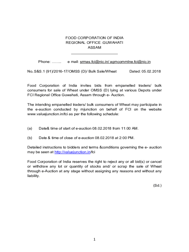 FOOD CORPORATION OF INDIA REGIONAL OFFICE :GUWAHATI ASSAM ___ Phone:.e-mail: srmas.fci@nic.in/ agmcommlne.fci@nic.inNo. S&S.1 (91)/201617/OMSK (D)/ Bulk Sale/Whetted: 05.02.2018Food Corporation of