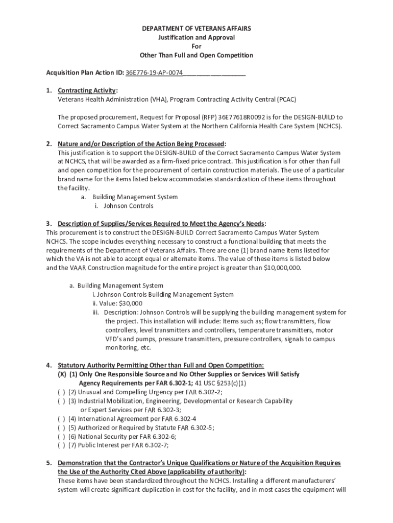 DEPARTMENT OF VETERANS AFFAIRS Justification and Approval For Other Than Full and Open Competition Acquisition Plan Action ID: 36E77619AP0074___ 1. Contracting Activity: Veterans Health Administration