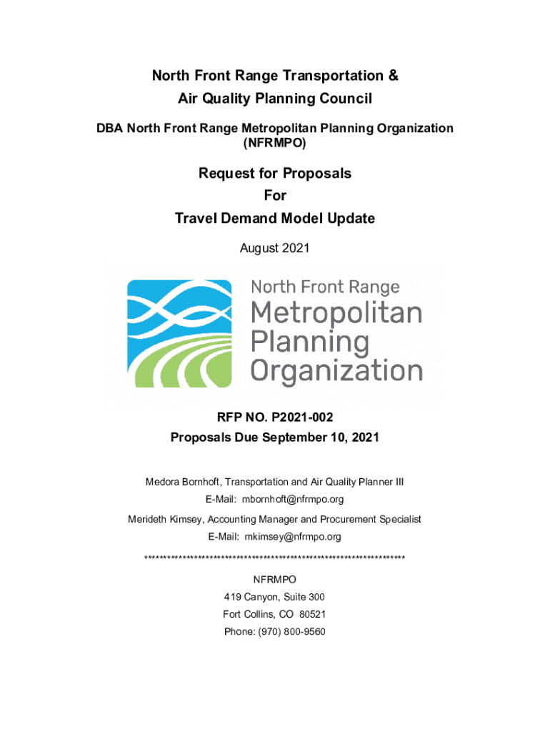 North Front Range Transportation & Air Quality Planning Council DBA North Front Range Metropolitan Planning Organization (NORMAL)Request for Proposals For Travel Demand Model Update August 2021RFP