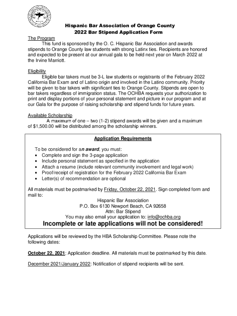 Hispanic Bar Association of Orange County 2022 Bar Stipend Application Form The Program This fund is sponsored by the O. C. Hispanic Bar Association and awards stipends to Orange County law students