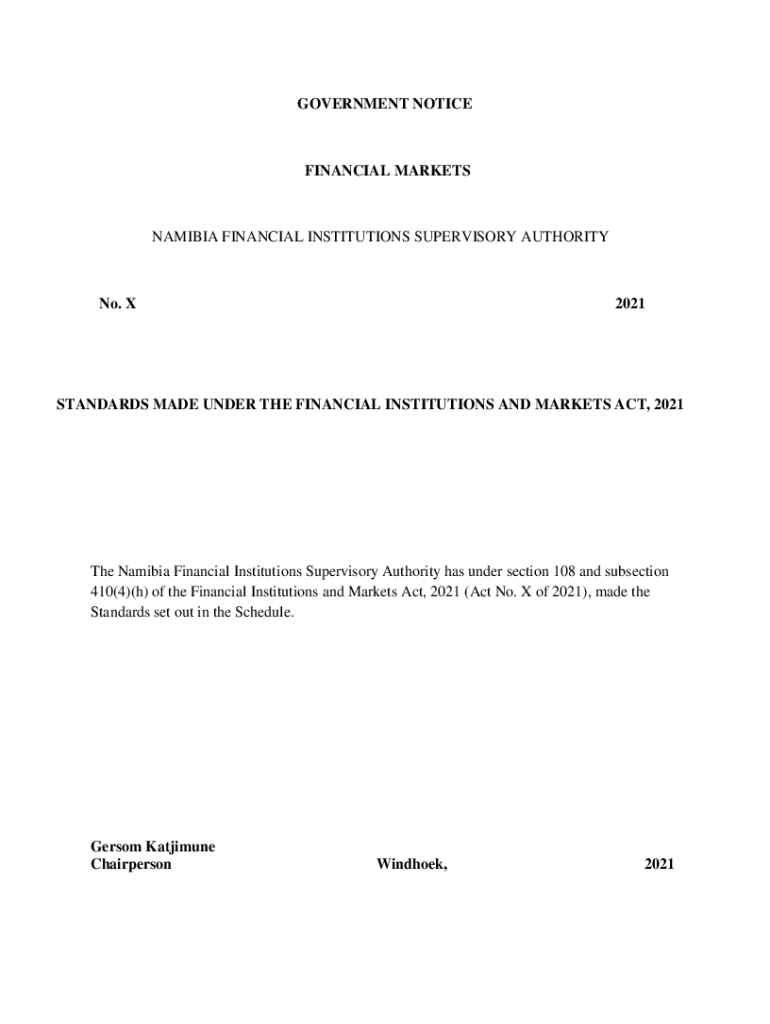 GOVERNMENT NOTICEFINANCIAL MARKETSNAMIBIA FINANCIAL INSTITUTIONS SUPERVISORY AUTHORITY No. X2021STANDARDS MADE UNDER THE FINANCIAL INSTITUTIONS AND MARKETS ACT, 2021The Namibia Financial Institutions