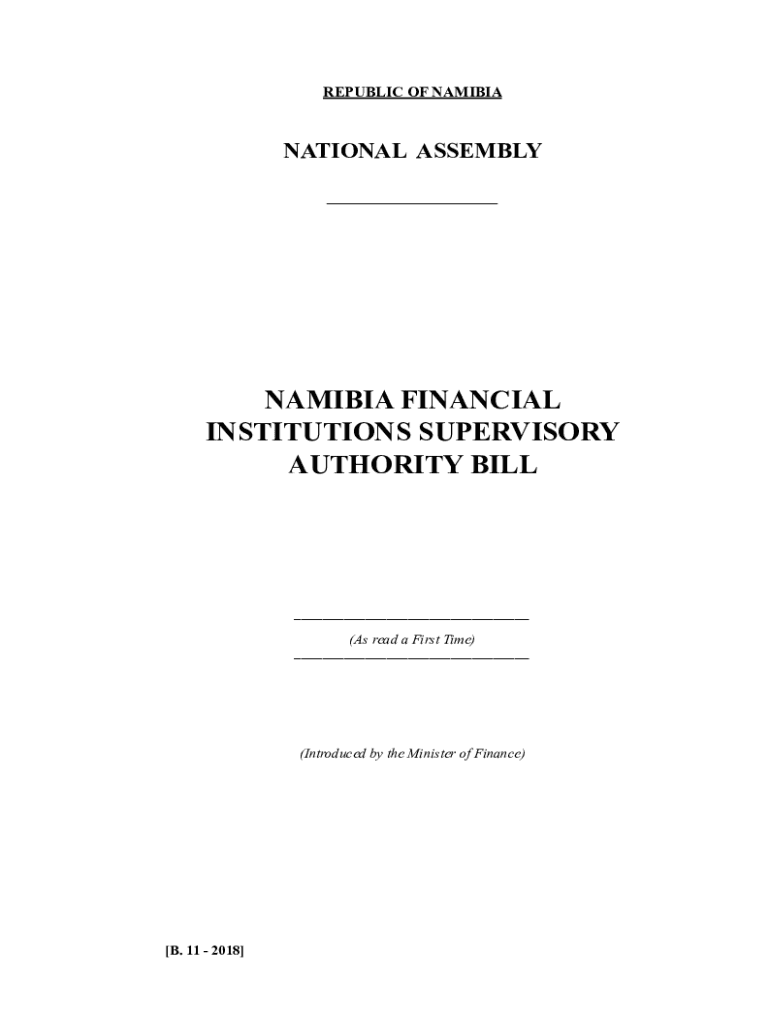 REPUBLIC OF NAMIBIANATIONAL ASSEMBLY ___Namibia Financial Institutions Supervisory Authority bill___ (As read a First Time) ___(Introduced by the Minister of Finance)[B. 11 2018]2BILL To provide for