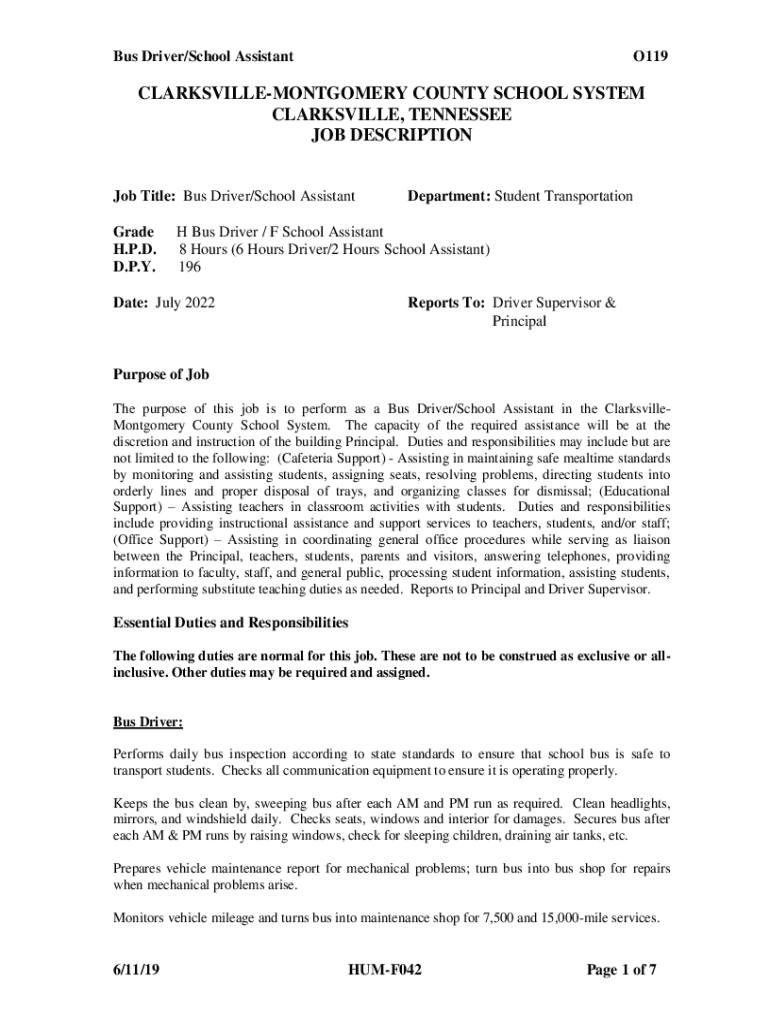 Bus Driver/School AssistantO119CLARKSVILLEMONTGOMERY COUNTY SCHOOL SYSTEM CLARKSVILLE, TENNESSEE JOB DESCRIPTION Job Title: Bus Driver/School Assistant Grade H.P.D. D.P.Y. Department: Student Transportation