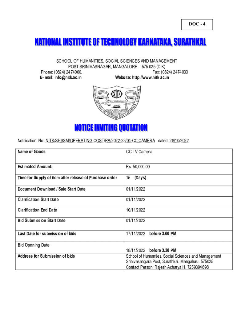 Get the free No: NITK/SHSSM/OPERATING COST/RA/2022-23/04-CC CAMERA dated: 28/10/2022