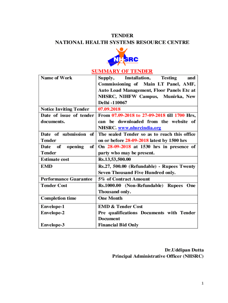 TENDER NATIONAL HEALTH SYSTEMS RESOURCE CENTRESUMMARY OF TENDER Name of Resupply, Installation, Testing and Commissioning of Main LT Panel, AMF, Auto Load Management, Floor Panels Etc at NH SRC, NOHOW
