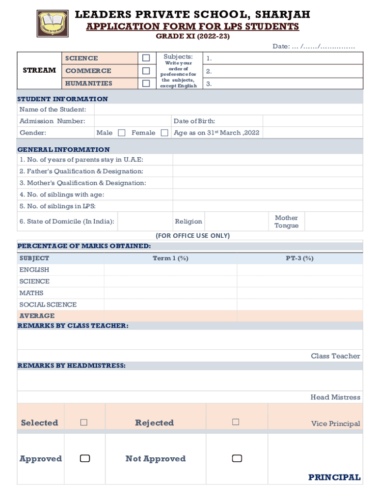 LEADERS PRIVATE SCHOOL, SHARIAH APPLICATION FORM FOR LPS STUDENTS GRADE XI (202223) Date: // SCIENCESTREAMCOMMERCE HUMANITIESSubjects:Write your order of preference for the subjects, except English1.