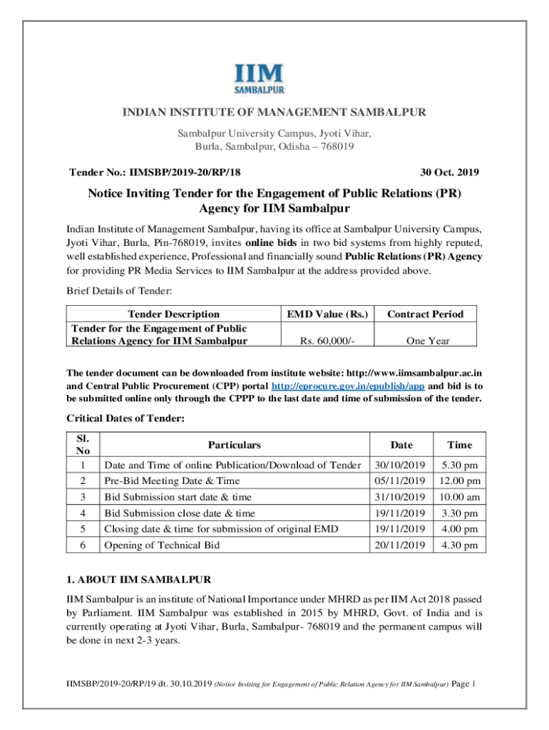 INDIAN INSTITUTE OF MANAGEMENT JABALPUR University Campus, Kyoto Vicar, Burley, Jabalpur, Odisha 768019 Tender No.: ISBN/201920/RP/1830 Oct. 2019Notice Inviting Tender for the Engagement of Public