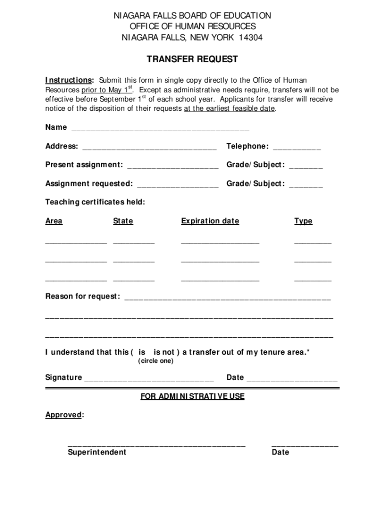 NIAGARA FALLS BOARD OF EDUCATION OFFICE OF HUMAN RESOURCES NIAGARA FALLS, NEW YORK 14304 TRANSFER REQUEST Instructions: Submit this form in single copy directly to the Office of Human Resources prior