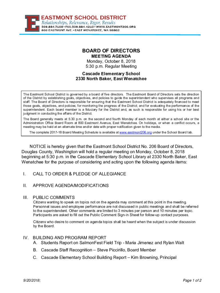 BOARD OF DIRECTORS MEETING AGENDA Monday, October 8, 2018 5:30 p.m. Regular Meeting Cascade Elementary School 2330 North Baker, East Wenatchee Eastman School District is governed by a board of five