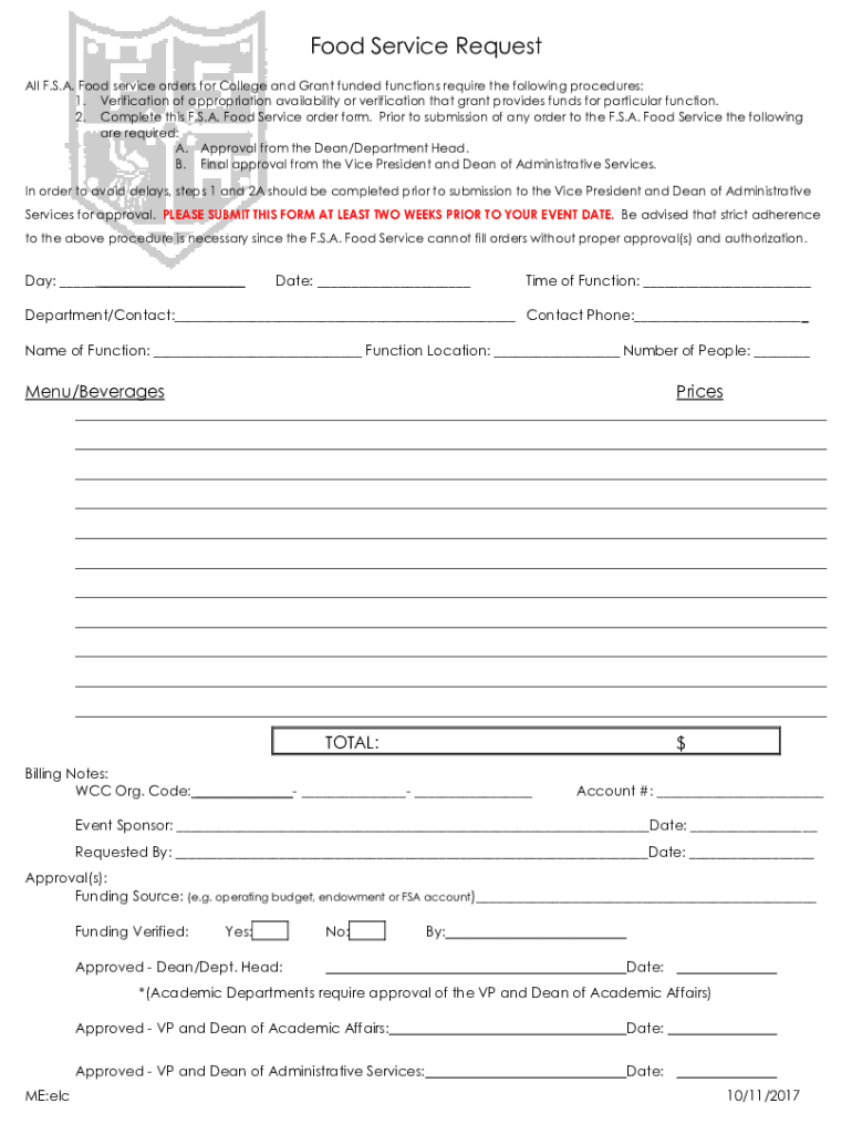 Food Service Requests All F.S.A. Food service orders for College and Grant funded functions require the following procedures: 1. Verification of appropriation availability or verification that grant
