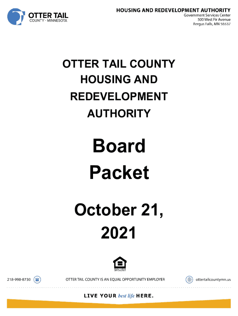 OTTER TAIL COUNTY HOUSING AND REDEVELOPMENT AUTHORITYBoard Packet October 21, 2021OTTER TAIL COUNTY HOUSING AND REDEVELOPMENT AUTHORITY AGENDA October 21, 2021 3:30 P.M. 1. Call Meeting to Order and