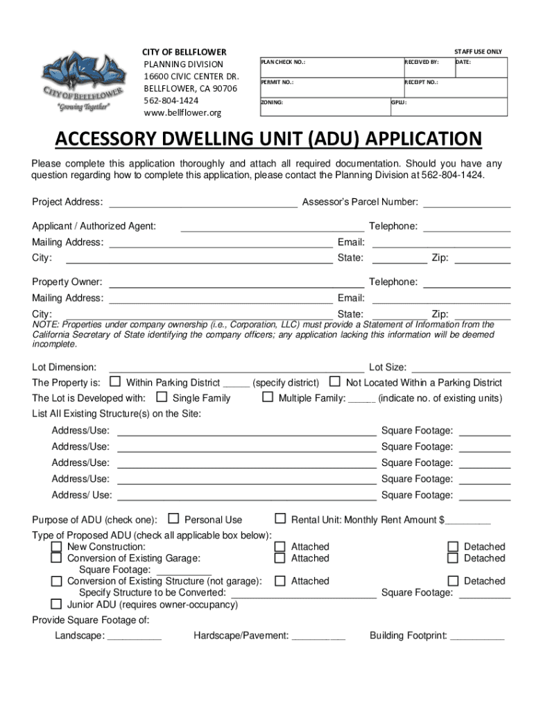 CITY OF BELLFLOWER PLANNING DIVISION 16600 CIVIC CENTER DR. BELLFLOWER, CA 90706 5628041424 www.bellflower.orgSTAFF USE ONLY PLAN CHECK NO.:RECEIVED BY:PERMIT NO.:RECEIPT NO.:ZONING:DATE:GPL:ACCESSORY
