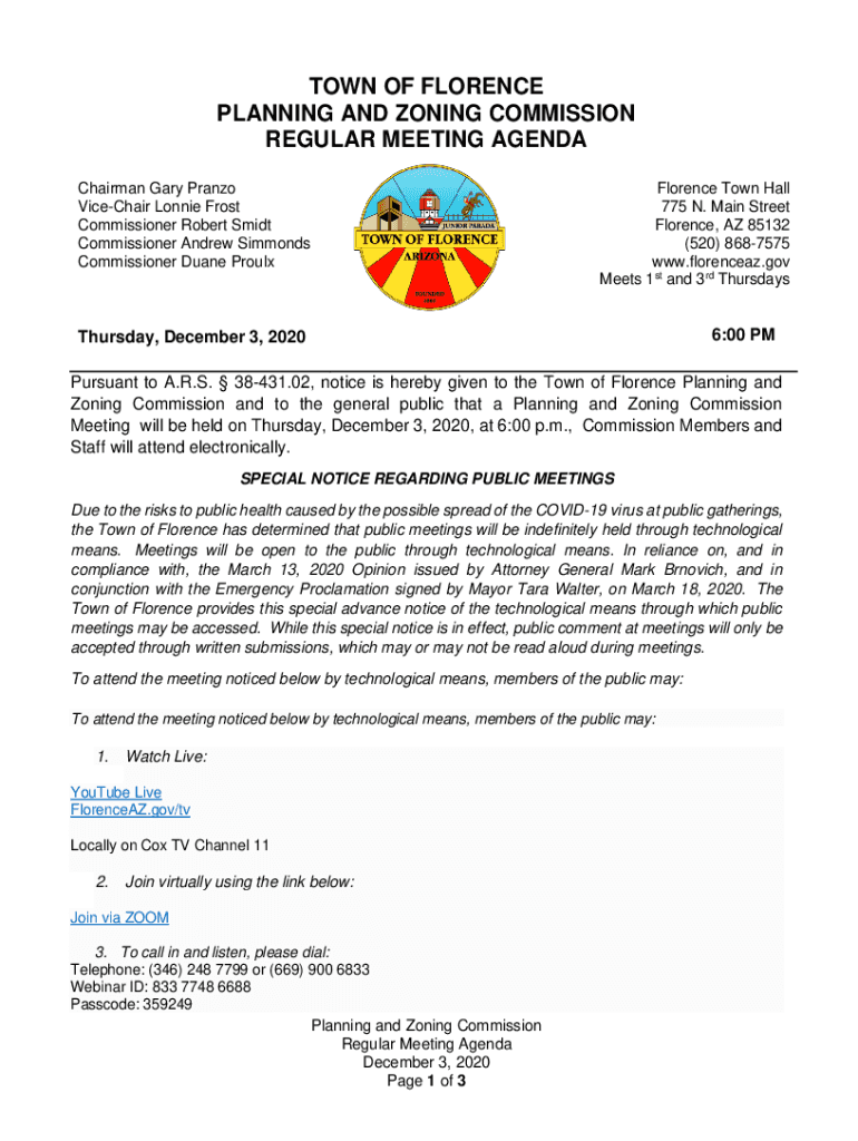 TOWN OF FLORENCE PLANNING AND ZONING COMMISSION REGULAR MEETING AGENDA Chairman Gary Piano Timeshare Lonnie Frost Commissioner Robert Said Commissioner Andrew Simmonds Commissioner Duane ProulxFlorence