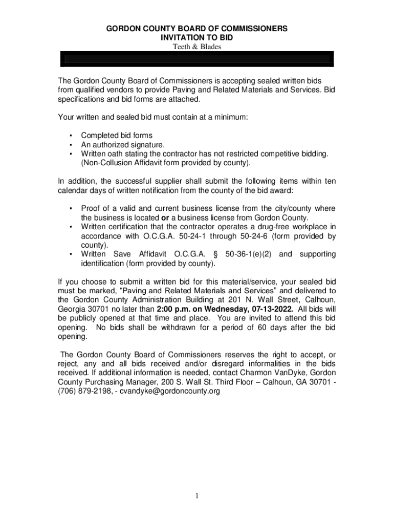 GORDON COUNTY BOARD OF COMMISSIONERS INVITATION TO BID Teeth & Blades Gordon County Board of Commissioners is accepting sealed written bids from qualified vendors to provide Paving and Related Materials