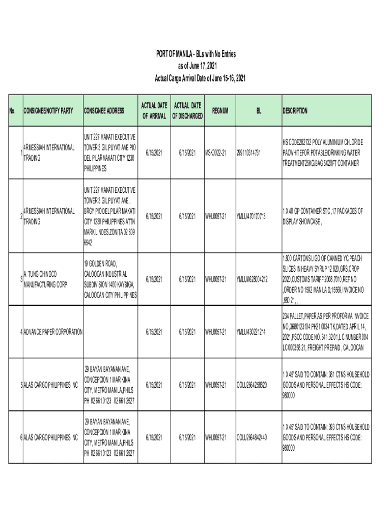 Get the free PORT OF MANILA - BLs with No Entries as of June 17, 2021 ...
