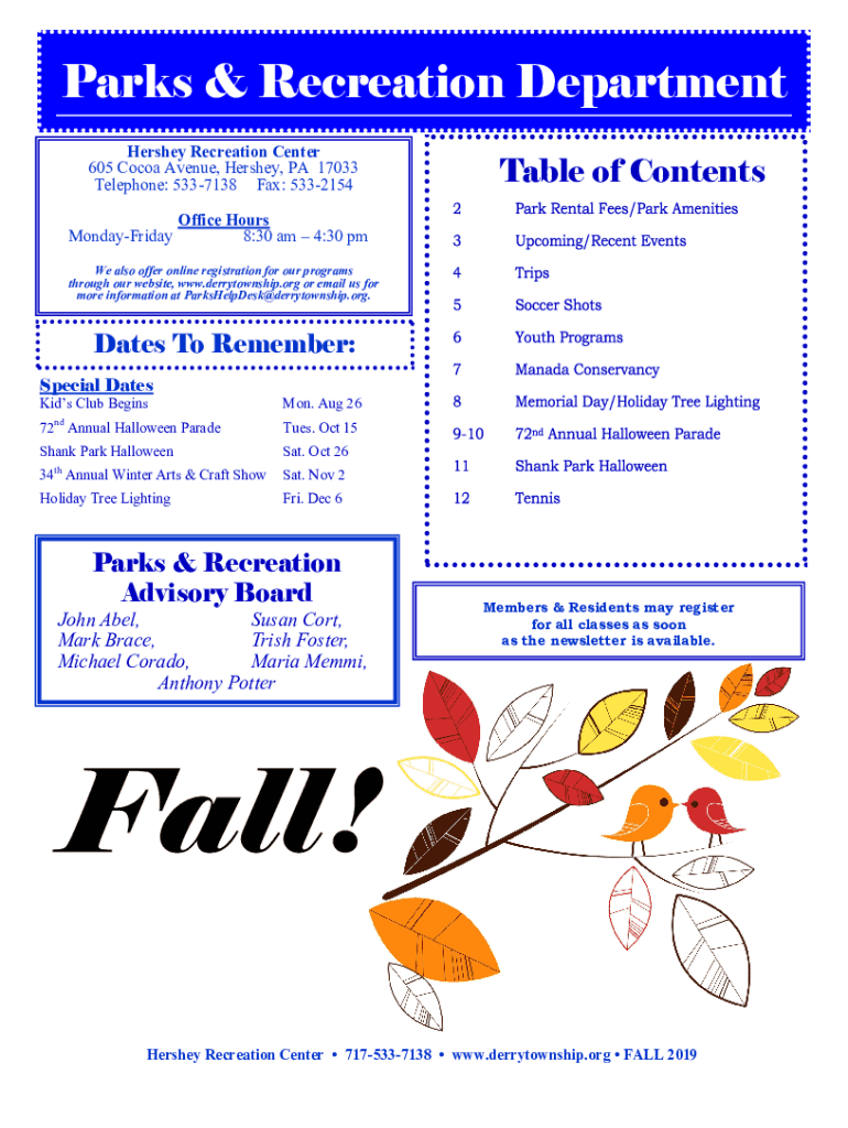 Parks & Recreation Department Hershey Recreation Center 605 Cocoa Avenue, Hershey, PA 17033 Telephone: 5337138 Fax: 5332154 MondayFridayTable of ContentsOffice Hours 8:30 am 4:30 PME also offer online