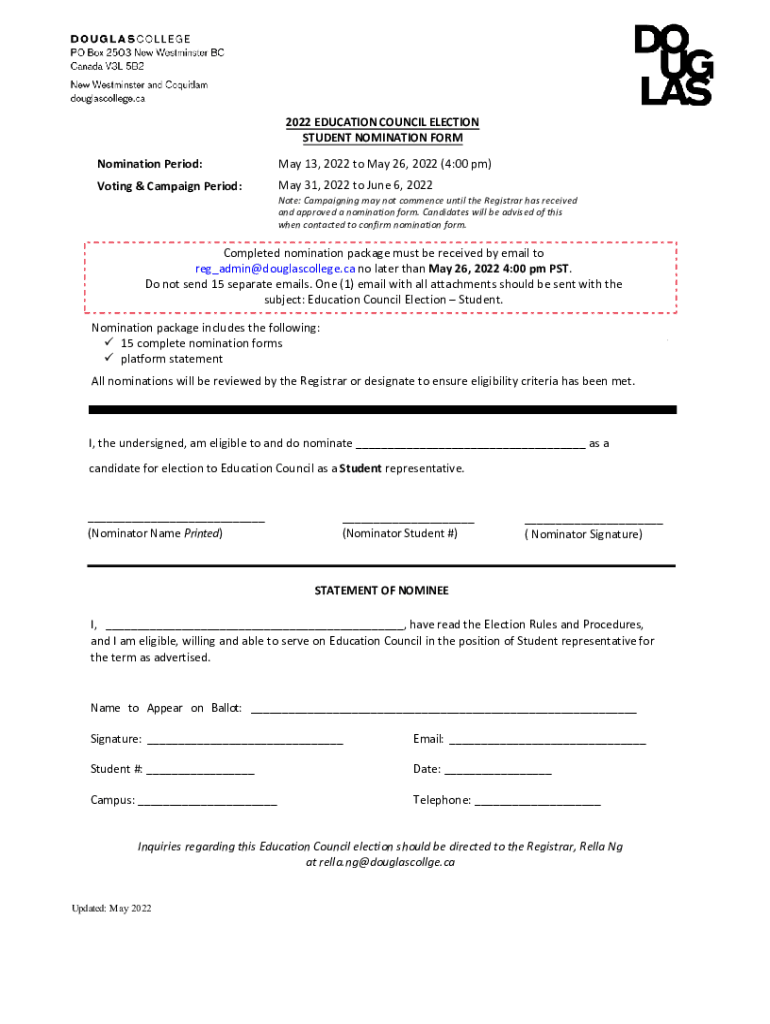 2022 EDUCATION COUNCIL ELECTION STUDENT NOMINATION FORM Nomination Period: Voting & Campaign Period:May 13, 2022, to May 26, 2022 (4:00 pm) May 31, 2022, to June 6, 2022Note: Campaigning may not commence