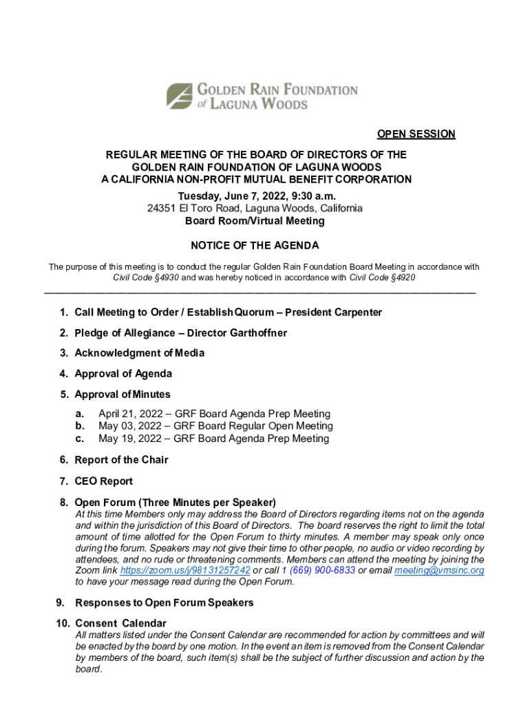 OPEN SESSION REGULAR MEETING OF THE BOARD OF DIRECTORS OF THE GOLDEN RAIN FOUNDATION OF LAGUNA WOODS A CALIFORNIA NONPROFIT MUTUAL BENEFIT CORPORATION Tuesday, June 7, 2022, 9:30 a.m. 24351 El Too
