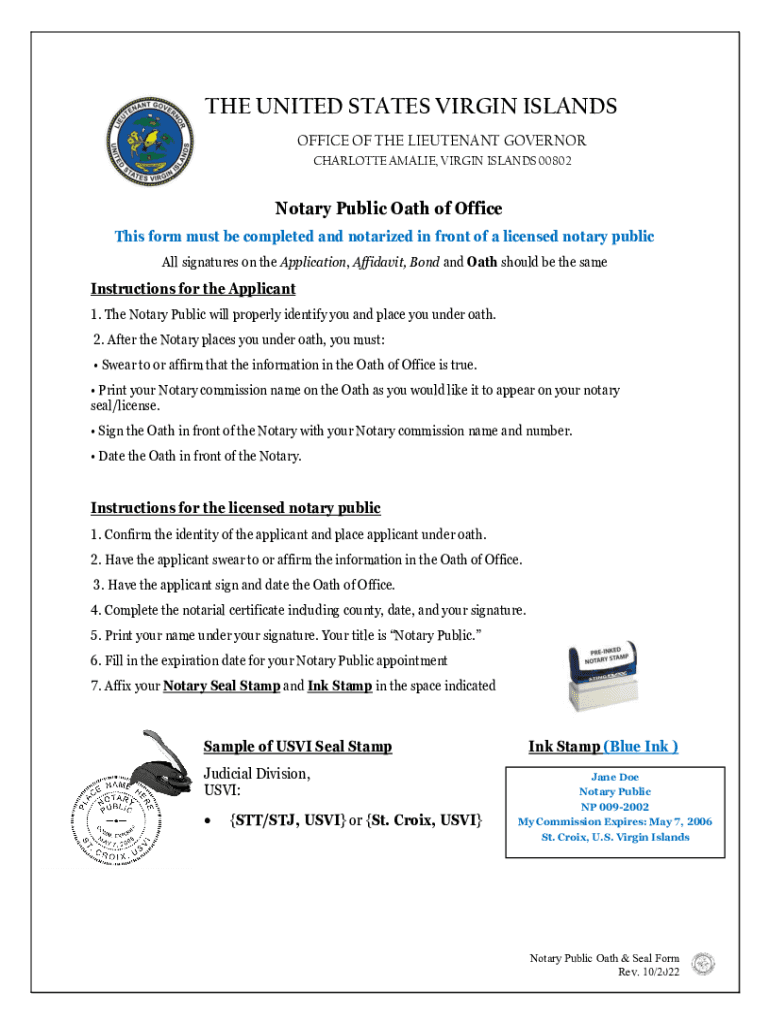 THE UNITED STATES VIRGIN ISLANDS OFFICE OF THE LIEUTENANT GOVERNOR CHARLOTTE AMALIA, VIRGIN ISLANDS 00802Notary Public Oath of Office This form must be completed and notarized in front of a licensed