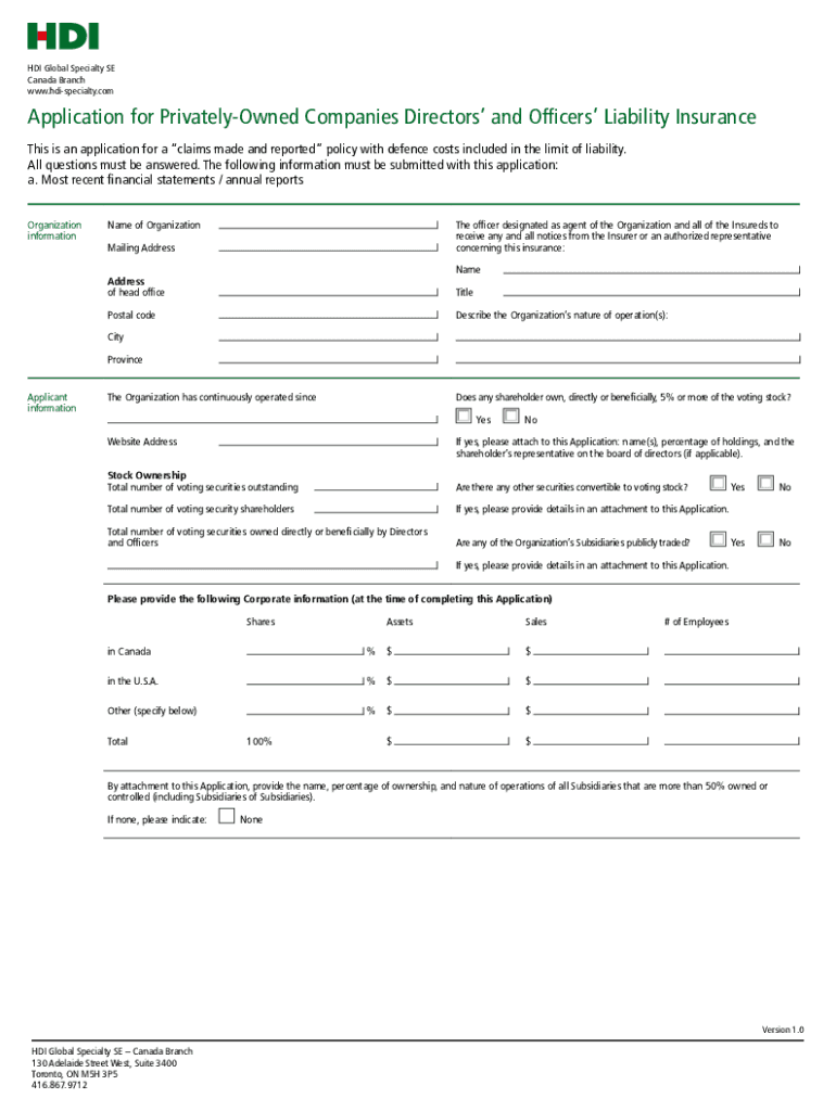 HDI Global Specialty SE Canada Branch www.hdispecialty.comApplication for PrivatelyOwned Companies Directors and Officers Liability Insurance This is an application for a claim made and reported policy