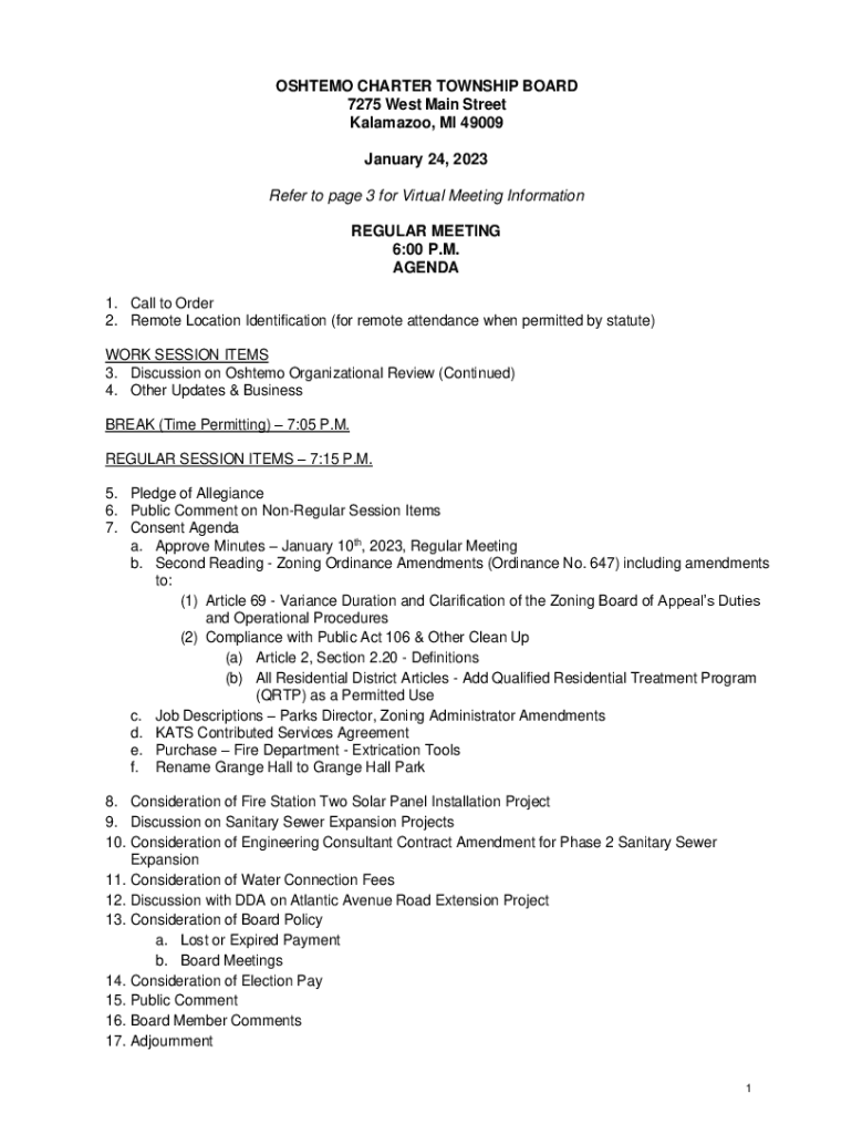 STEM CHARTER TOWNSHIP BOARD 7275 West Main Street Kalamazoo, MI 49009 January 24, 2023, Refer to page 3 for Virtual Meeting Information REGULAR MEETING 6:00 P.M. AGENDA 1. Call to Order 2. Remote