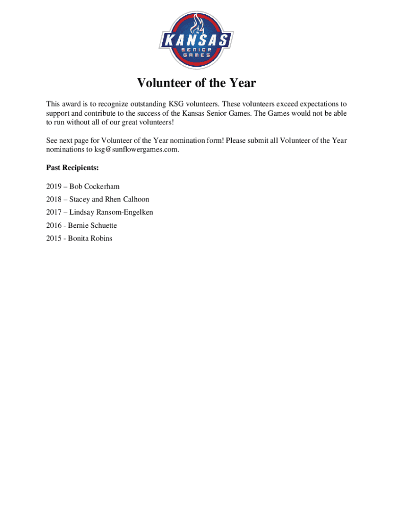 Volunteer of the Year This award is to recognize outstanding KG volunteers. These volunteers exceed expectations to support and contribute to the success of the Kansas Senior Games. The Games would