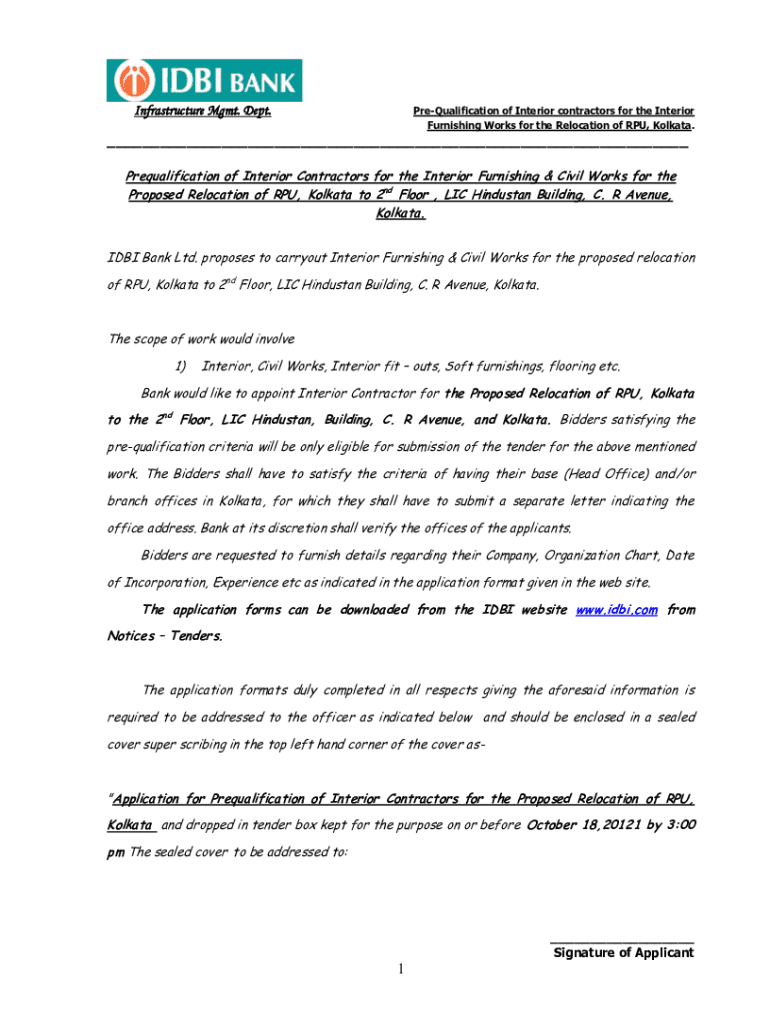Infrastructure Mgmt. Dept. PreQualification of Interior contractors for the Interior Furnishing Works for the Relocation of RPU, Kolkata.___ Prequalification of Interior Contractors for the Interior