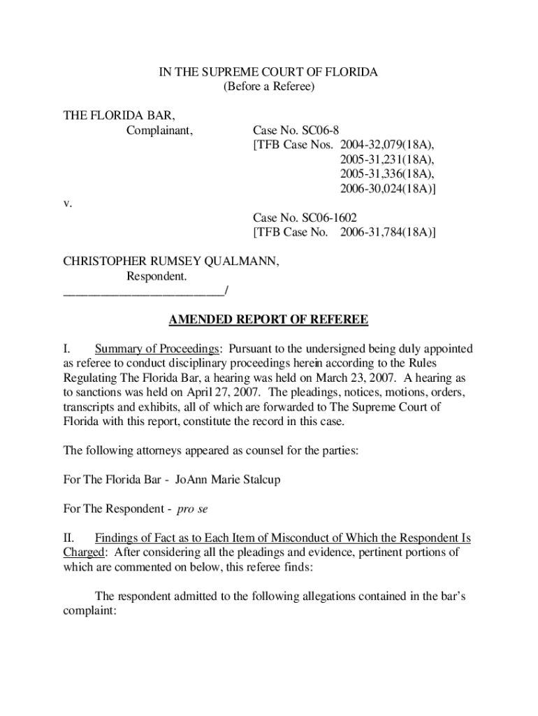 IN THE SUPREME COURT OF FLORIDA (Before a Referee) THE FLORIDA BAR, Complainant, Case No. SC068 [TFB Case Nos. 200432,079(18A), 200531,231(18A), 200531,336(18A), 200630,024(18A)]v. Case No. SC061602