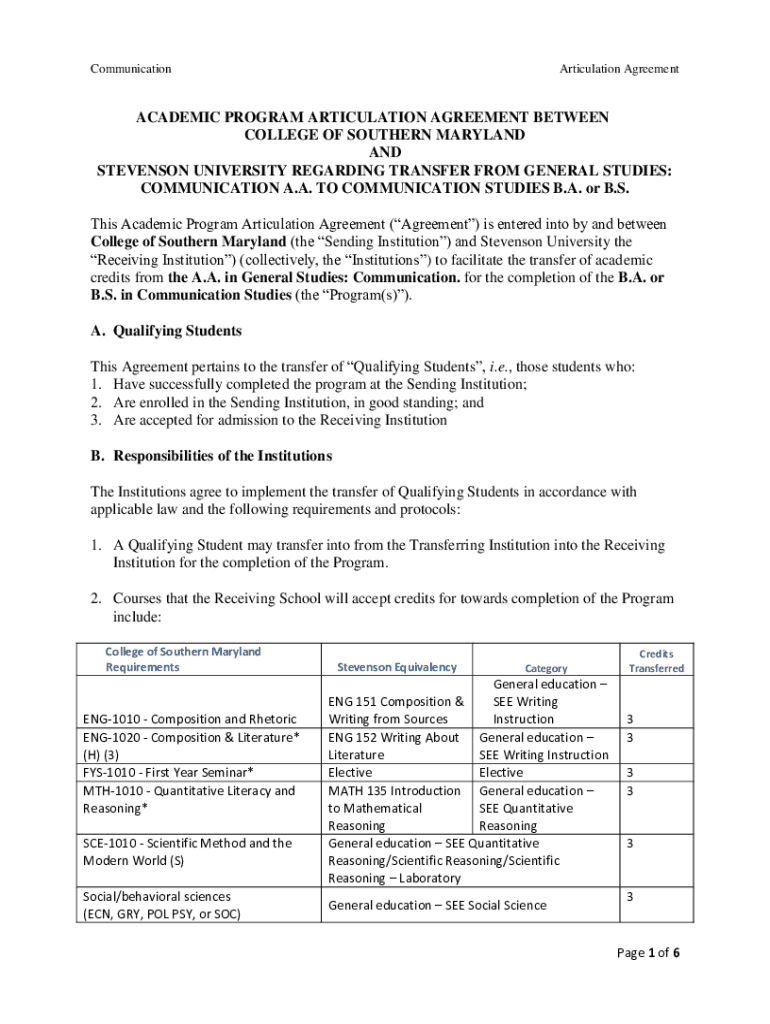 CommunicationArticulation AgreementACADEMIC PROGRAM ARTICULATION AGREEMENT BETWEEN COLLEGE OF SOUTHERN MARYLAND AND STEVENSON UNIVERSITY REGARDING TRANSFER FROM GENERAL STUDIES: COMMUNICATION A.A.