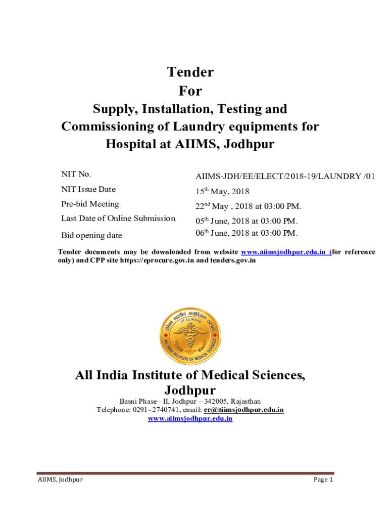 Tender For Supply, Installation, Testing and Commissioning of Laundry equipments for Hospital at AIMS, Jodhpur NIT No.AIIMSJDH/EE/ELECT/201819/LAUNDRY /01NIT Issue Date15th May, 2018Prebid Meeting22nd