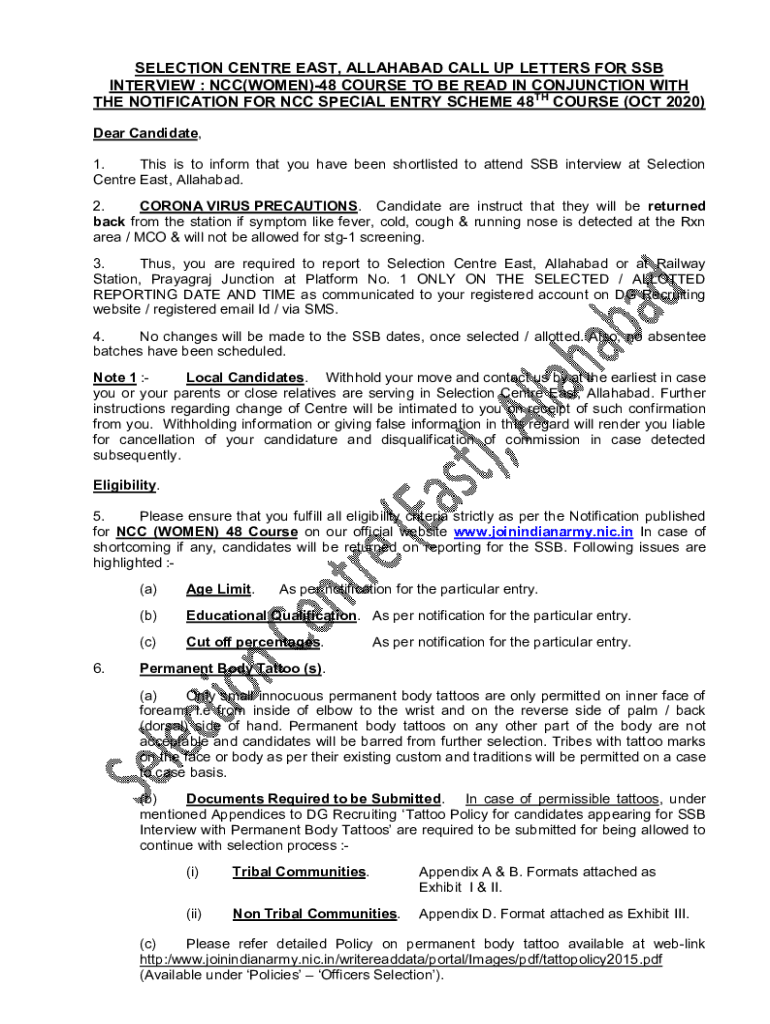 SELECTION Center EAST, ALLAHABAD Calls UP LETTERS FOR SSB INTERVIEW : NCC(WOMEN)48 COURSE TO BE READ IN CONJUNCTION WITH THE NOTIFICATION FOR NCC SPECIAL ENTRY SCHEME 48TH COURSE (OCT 2020) Dear Candidate,
