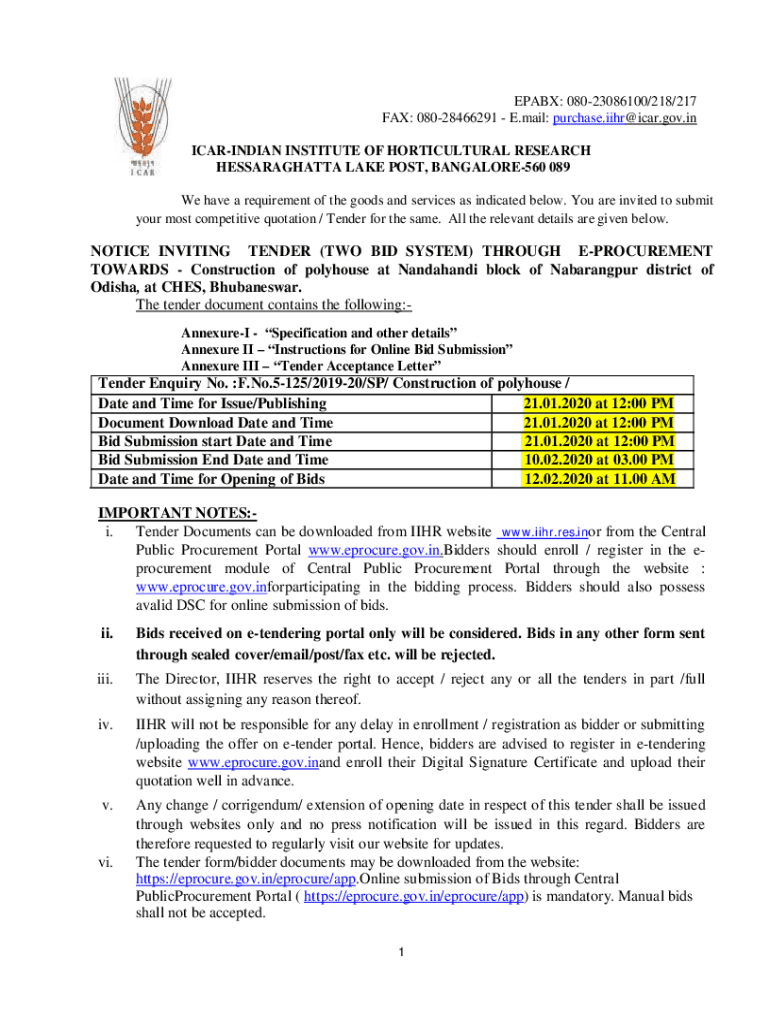 PBX: 08023086100/218/217 FAX: 08028466291 E.mail: purchase.iihr@icar.gov.in AMERINDIAN INSTITUTE OF HORTICULTURAL RESEARCH HESSARAGHATTA LAKE POST, BANGALORE560 089 We have a requirement of the goods