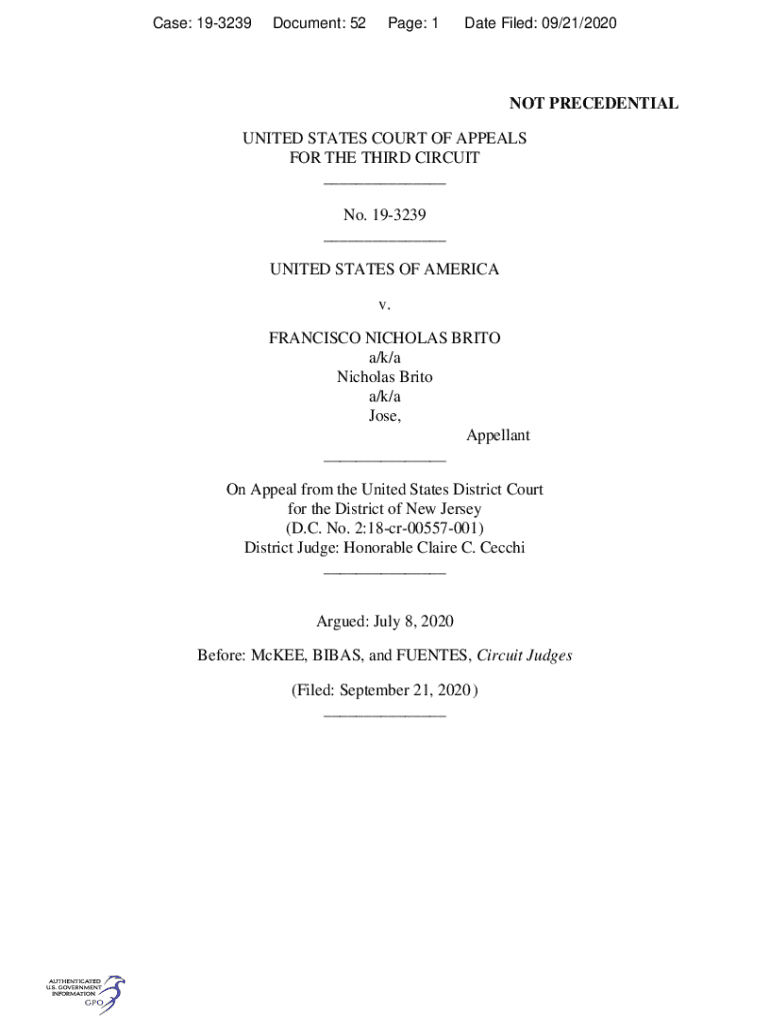 Case: 193239Document: 52Page: 1Date Filed: 09/21/2020NOT PRESIDENTIAL UNITED STATES COURT OF APPEALS FOR THE THIRD CIRCUIT ___ No. 193239 ___ UNITED STATES OF AMERICA v. FRANCISCO NICHOLAS BRIT a/k/a